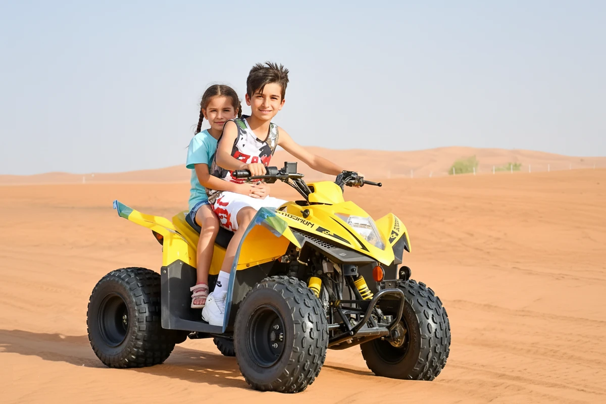 Enjoy a smooth and safe quad biking experience inside a fenced desert track designed specially for beginners and kids. This controlled area gives new riders a perfect place to learn, practice, and enjoy the thrill of quad biking without going into deep dunes. The ground is even, the space is secure, and trained guides stay close to help at every step, making it ideal for families and first-time riders. Kids can ride with confidence, parents can relax, and everyone can enjoy a fun and worry-free quad biking session at their own pace.